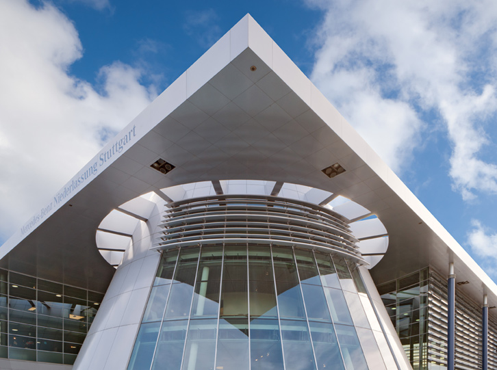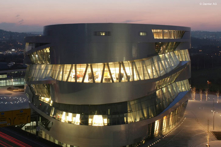 Ein künstlich aufgeschütteter Hügel trägt das 110.000 Tonnen schwere Mercedes-Benz-Museum in Stuttgart.